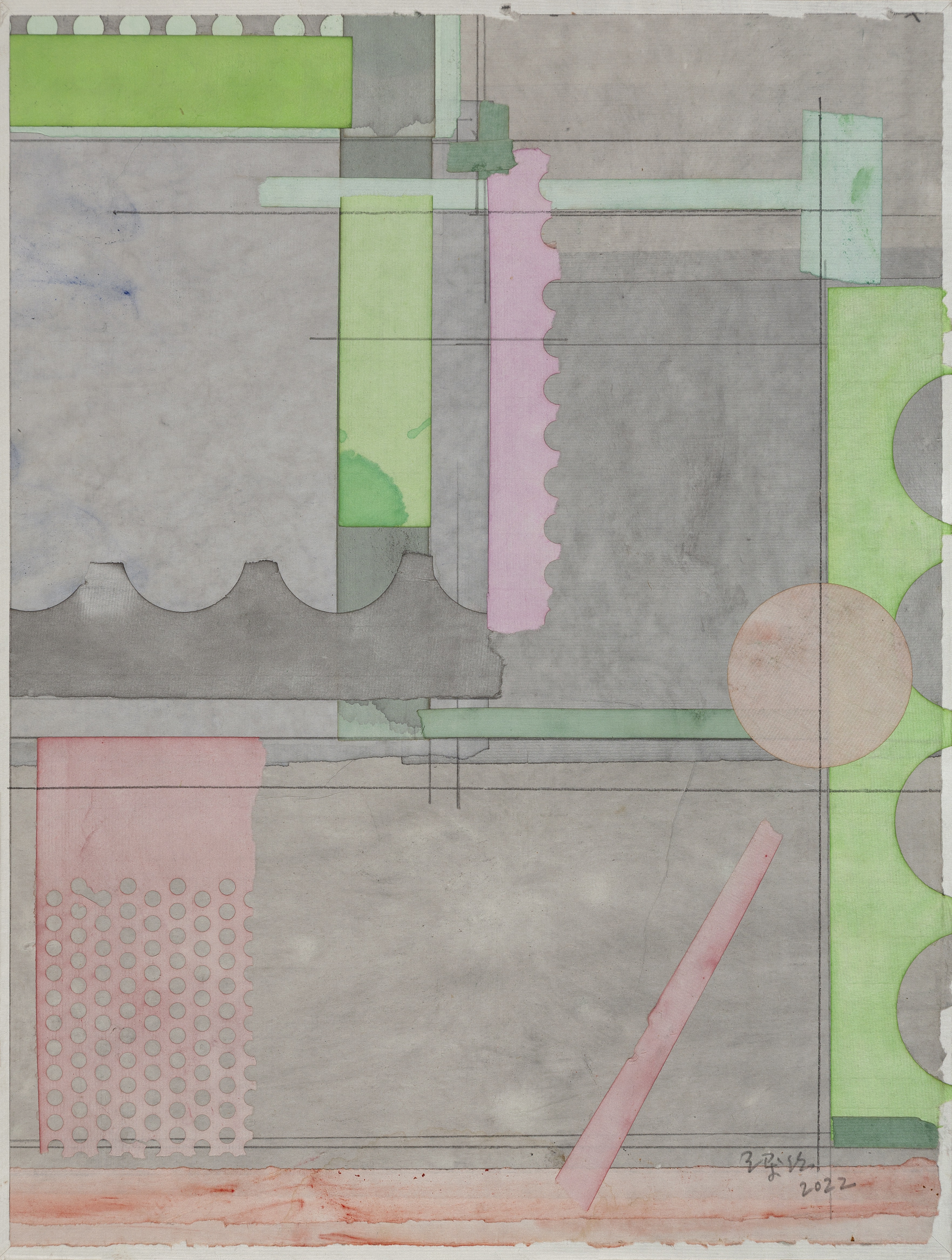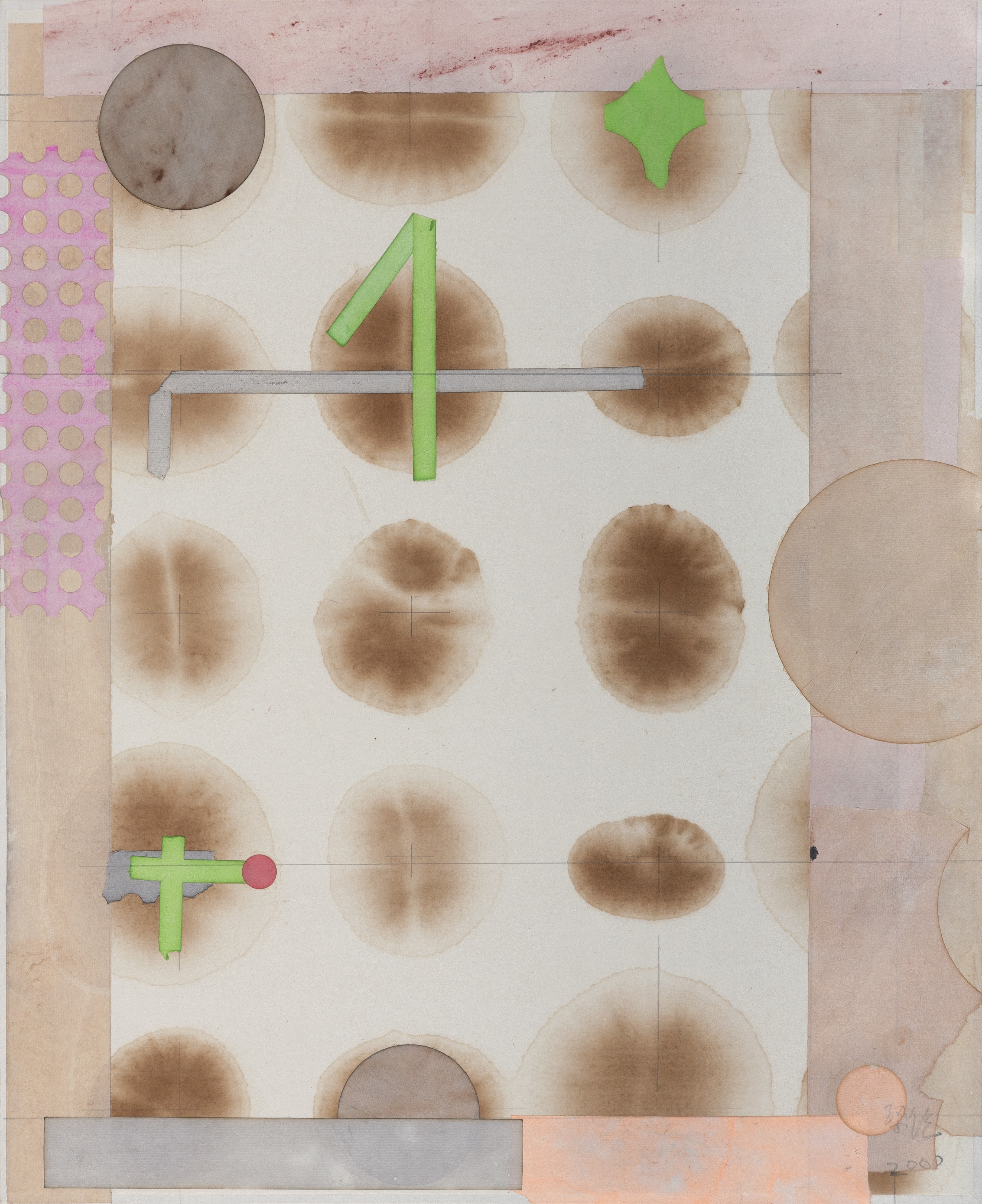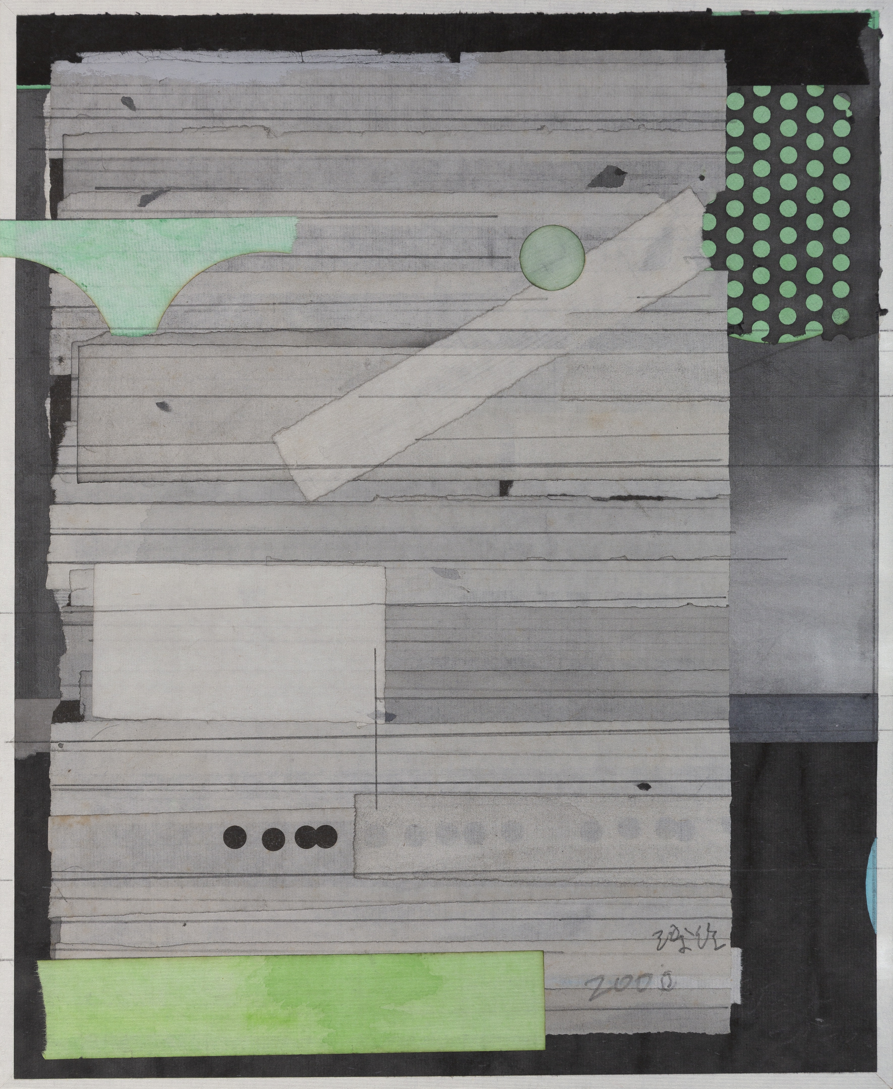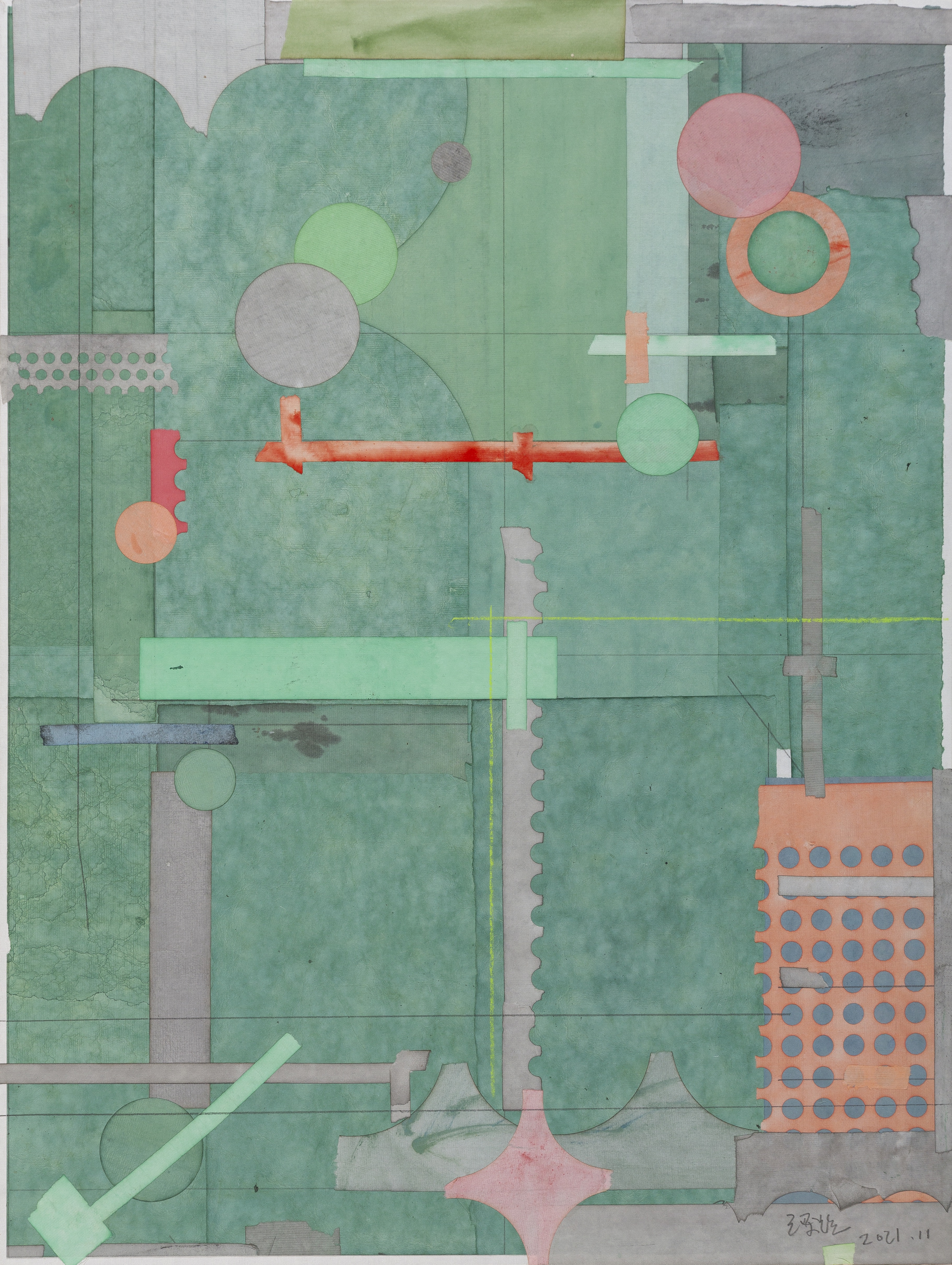 Liang Quan naturally makes a transfer of inherited meanings from Chinese ink painting and Western abstract art, and sums up a series of traditions and styles, in order to create his own visual vocabulary. His collages did not feature any specific figures, and are often manually executed with variations of layers, marks, and stains. They are elements of his art, just like dots, lines, and planes in abstract art. The creative aspect of the form is expressed by a series of paper strips, tea stains, and lines (see The Pleasure of Tea and Ink (2000) and A Letter Never Been Delivered (2000)). Liang tears rice paper into strips, soaks them in tea, and re-positions them in a vertical or horizontal composition. This process is typified by several pieces of the show’s highlights: The Monument (2011), Paradise (2011), and Green Bubbles (2022), among others.