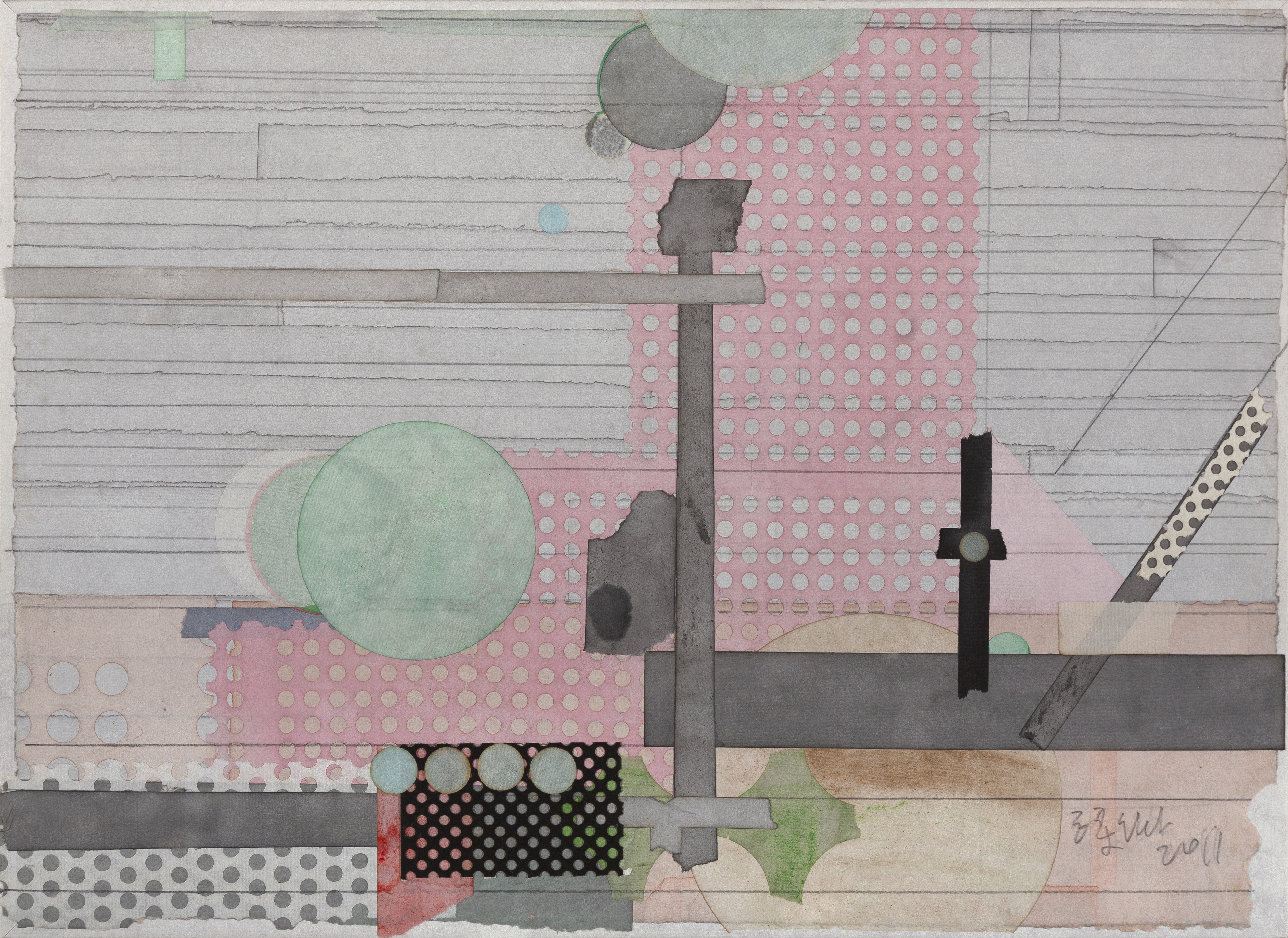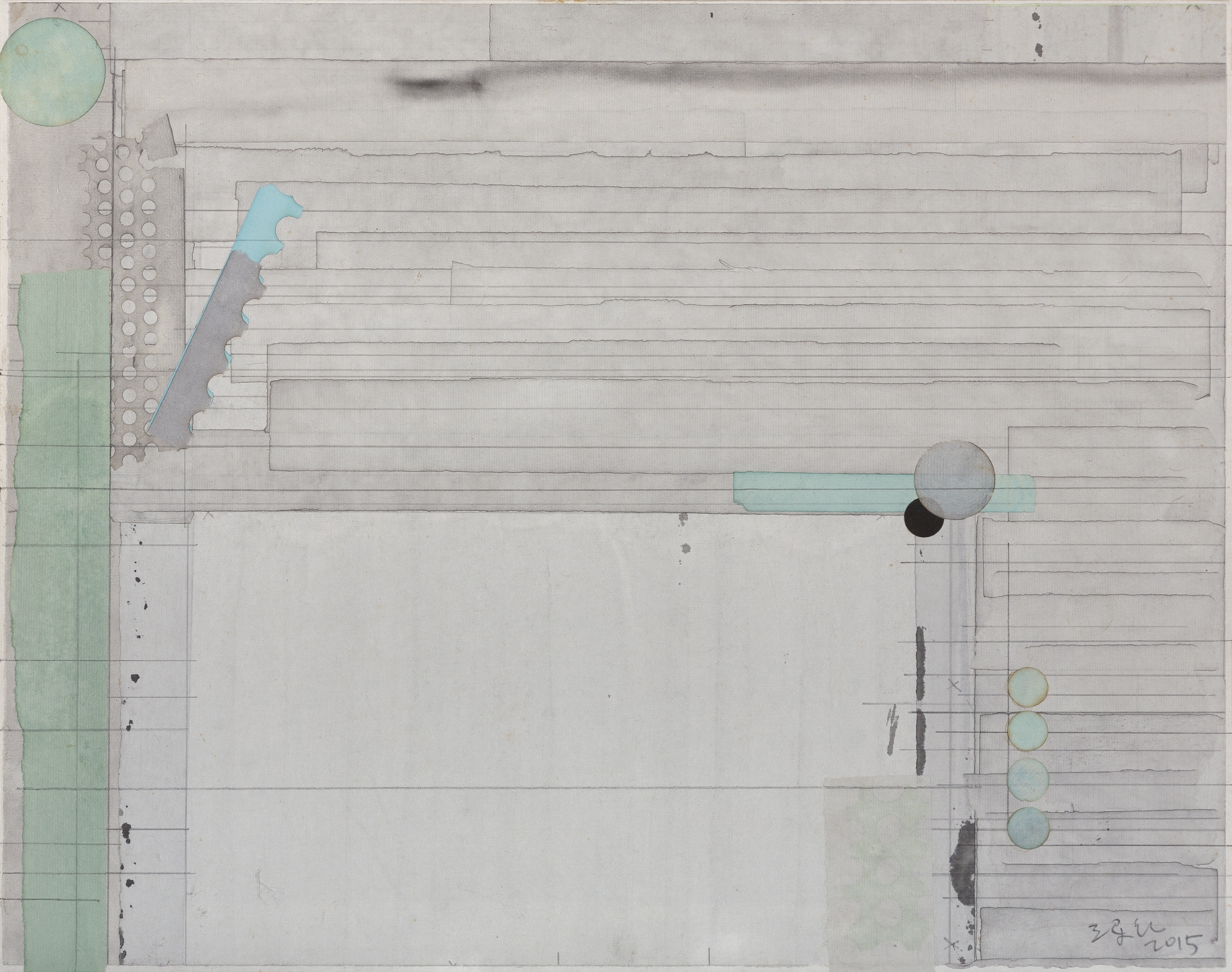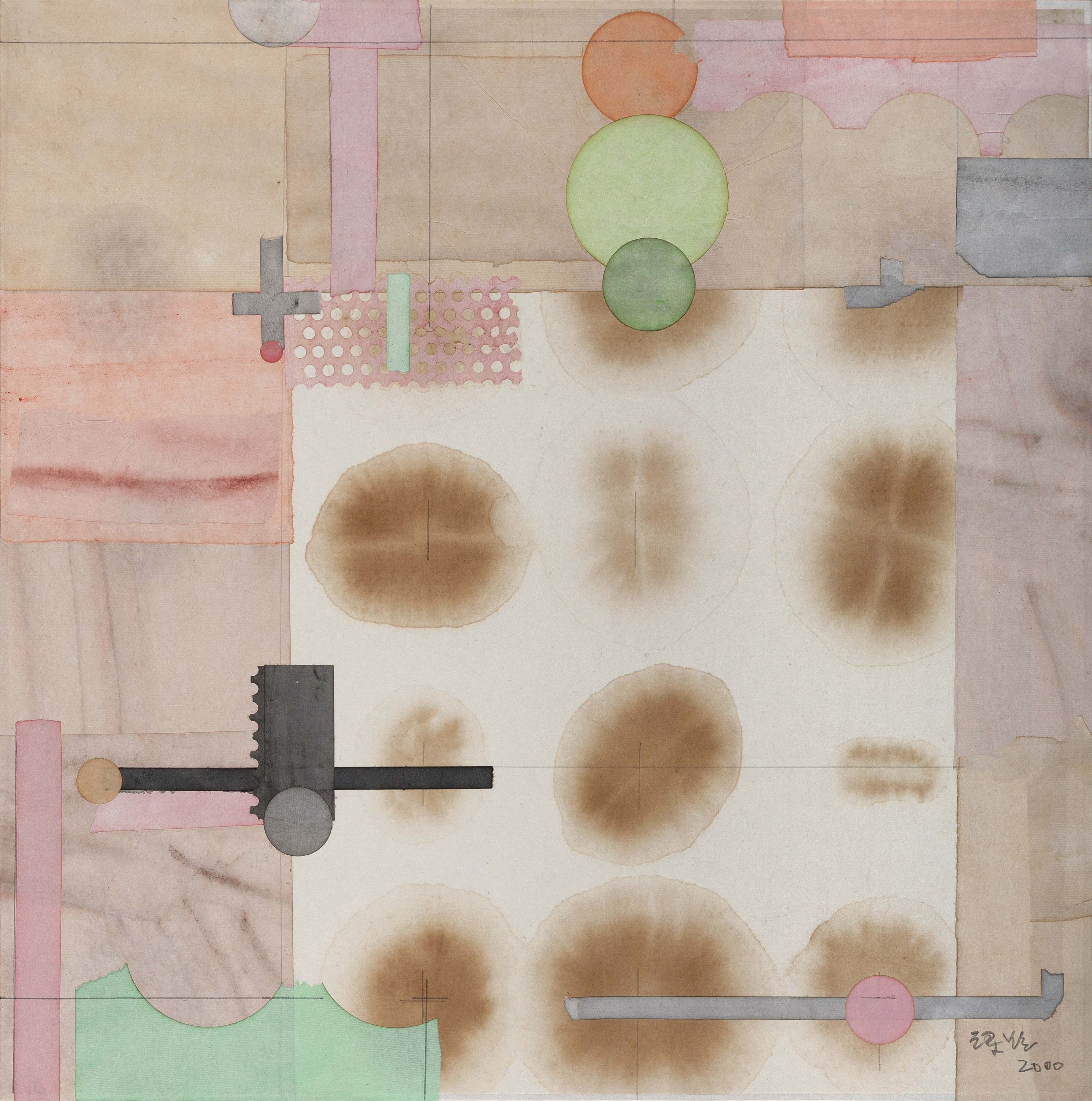 Liang Quan is a pioneer who merges eastern and western art. He adroitly embodies the core abstract art tenets using Chinese ink painting materials and approaches, with a reserved passion and silent confidence. Categories fail to do justice to the intricate nature of Liang’s art. Under various layers of his abstract, paper collage works, we can discern Bauhaus emblem, tea stains, and Ben-Day dots like commercial materials, which demonstrate Liang’s ability to move across not just media but also aesthetic positions.